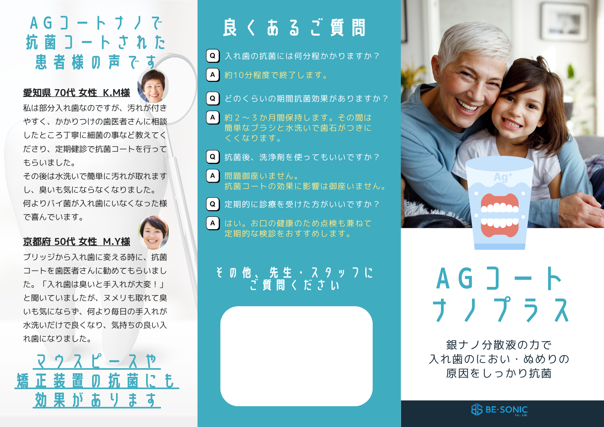・入れ歯や矯正装置、マウスピースの臭いやヌメリを細菌・カンジダ菌等を抗菌することで防ぎます。